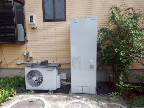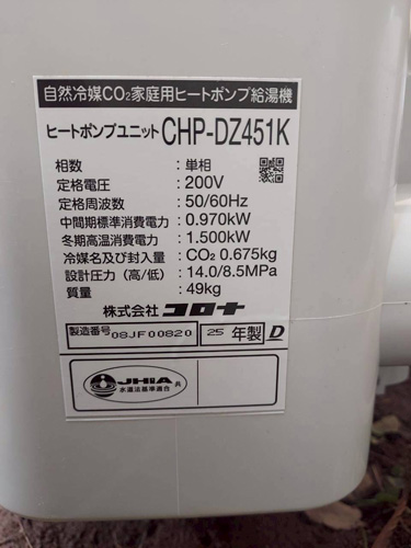 西多摩郡檜原村樋里 コロナ自然冷媒CO2家庭用ヒートポンプ給湯機ヒートポンプユニットCHP-DZ451K、貯湯ユニットCTU-37AZ1K エコキュート交換工事